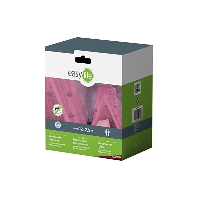 High quality and highly decorative mosquito net suitable for both single beds and double beds. The ring of the canopy can be dismantled or interlocked, creating a small transport volume. This makes the mosquito net the perfect travel companion. The maximum height is 250 cm, the maximum circumference 12.5 m. Connected ring diameter 60 cm. Colour: blue, apricot, orange, white, pink. Washable at 30 degrees. Transport dimensions: approx. 18 x 21 x 10 cm.