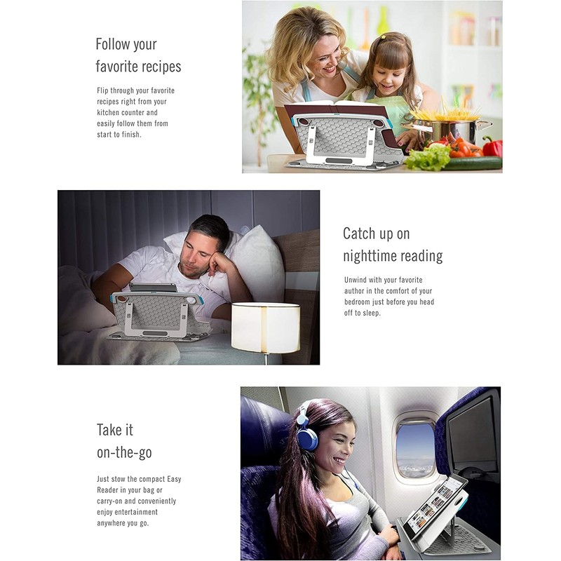 Take the Easy Reader® wherever you go as you can conveniently stow this compact (8.5” x 13.75”) lightweight book stand nicely in your backpack, tote bag, briefcase, carry-ons, travel bag etc., for when you’re on the move. Use it in the home, office, library, classroom, kitchen, dorm, indoor or outdoor.