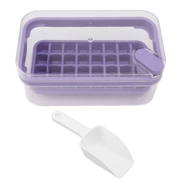 Easy Release Ice Cube Tray Plastic 32 Grids Ice Tray with Lid Bin Scoop for Freezer Purple