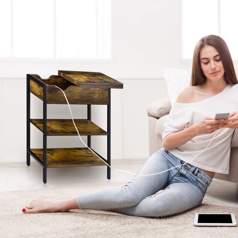 - Narrow End Table with Charging Station: The hidden compartment beneath the tabletop will help you organize your pad, remotes, game controllers, phone charger cords and other small things. The 2-Tier wooden shelves which you can place phone, lamps, books and etc.