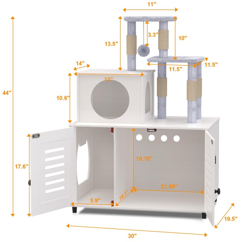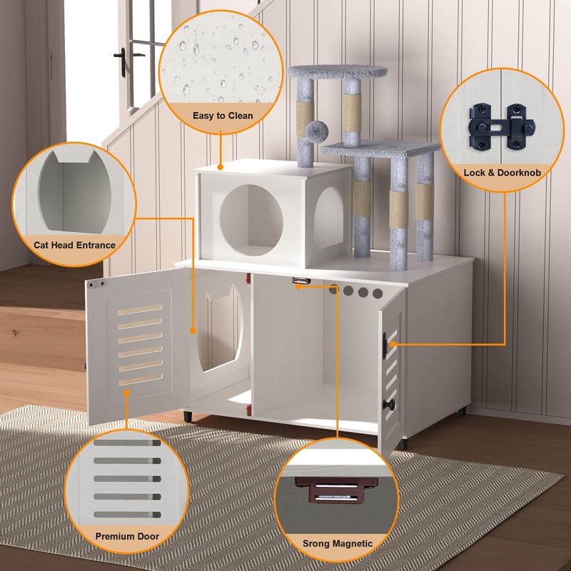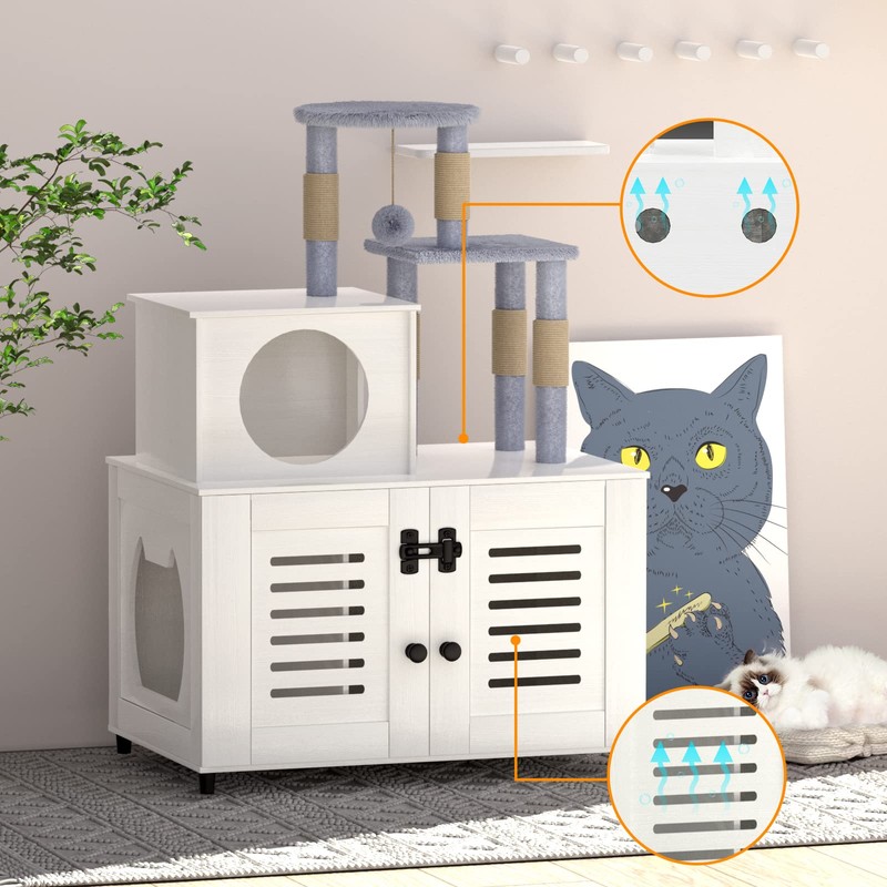 - LITTER BOX ENCLOSURE WITH CAT TREE: Spacious Cat hidden litter box with a cat tree on top, litter box enclosure provides your cat a relaxation and entertainment space while saving more space for your house.