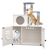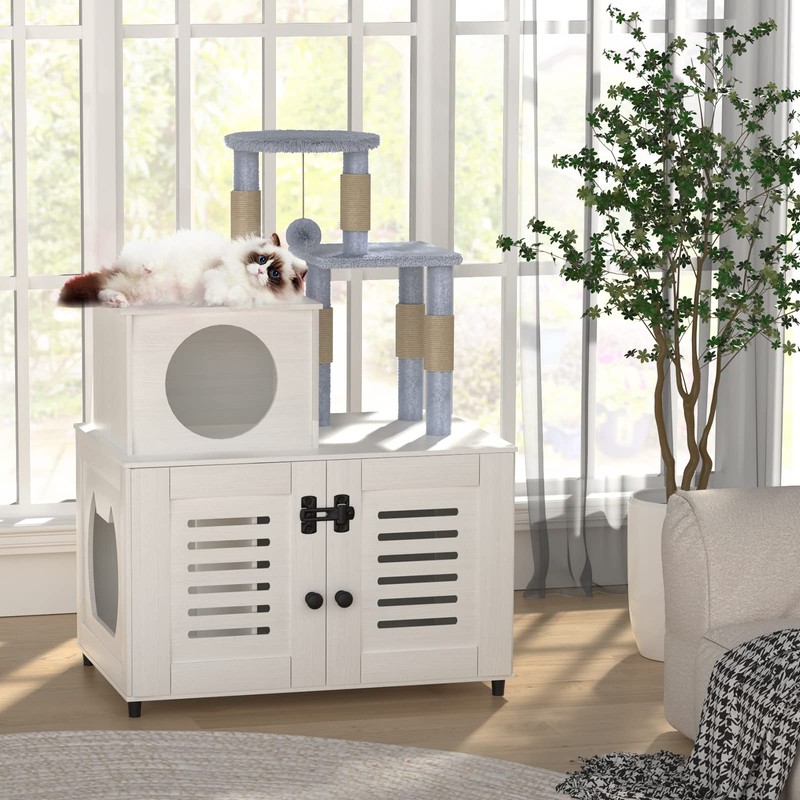 EasyCom Litter Box Enclosure, Hidden Cat Tree Tower Furniture for Indoor House, All-in-one Wooden Cat Litter Cabinet with Scratching Post and Condo, White