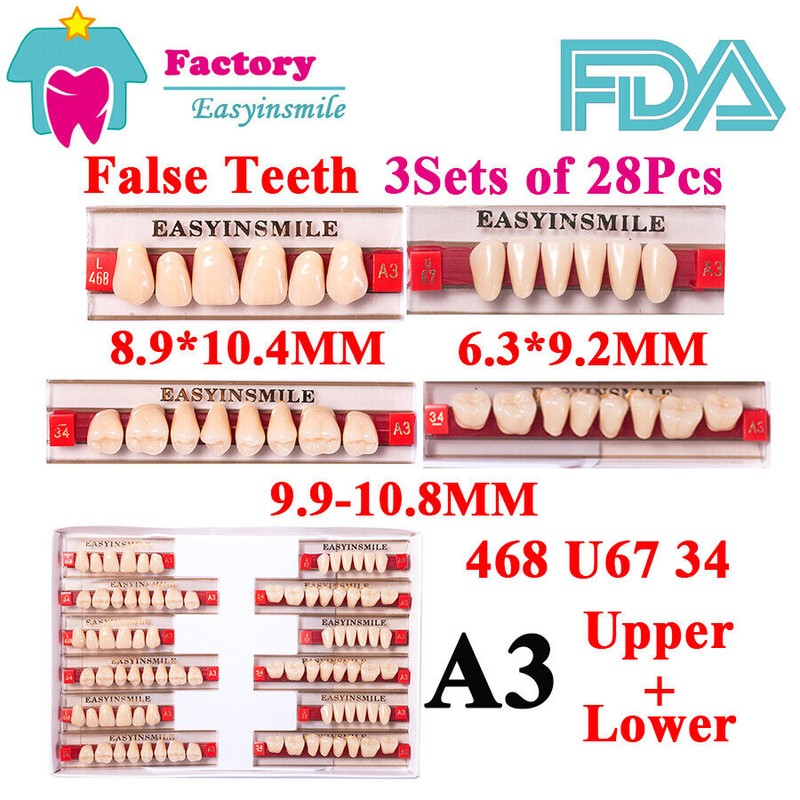 Easyinsmile A3 3Sets*28Pc Dental Acrylic Resin False Teeth DIY Denture Upper Lower Full Set