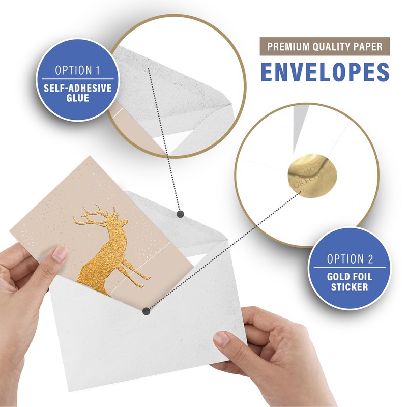- All-Inclusive Envelopes & Sealing Stickers: Each set includes white mailing envelopes with adhesive glue for effortless sealing. But that's not all – enjoy an extra touch of elegance with 16 gold foil "Seasons Greetings" sealing stickers. The perfect finish to your heartfelt wishes.