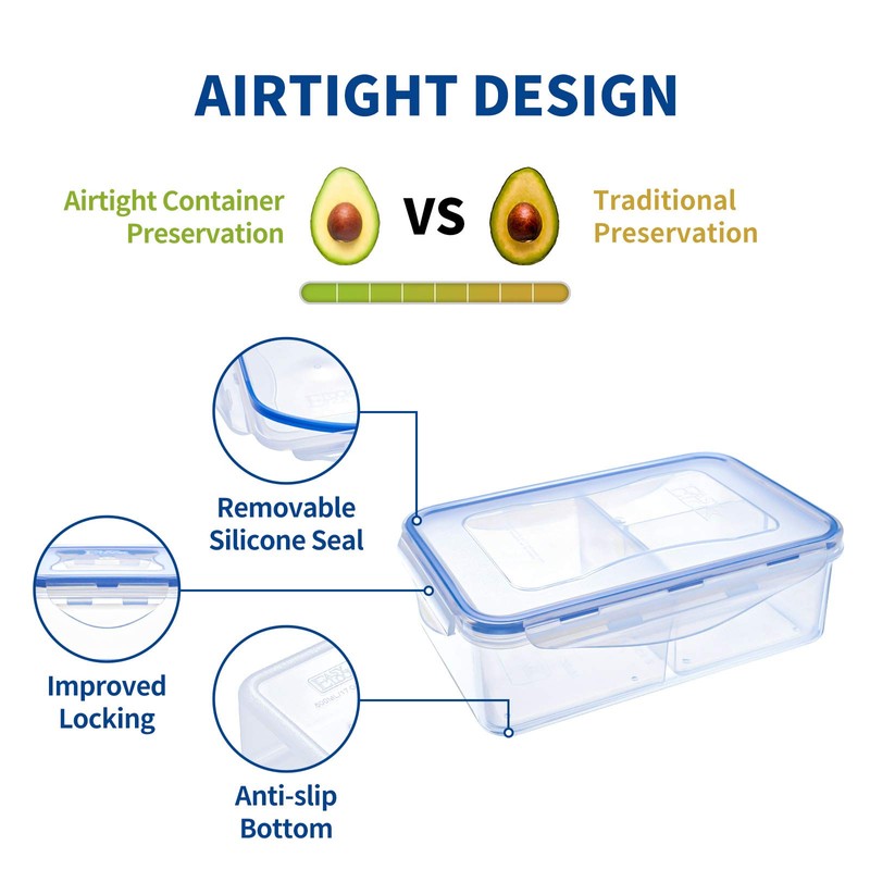- Lock the delicious food: Airtight food container with 4 snap airtight locking lid.The smart-locking system keeps it tightly sealed so meals are kept fresh for long time.Airtight food storage food container never endure spilled food in your bag again