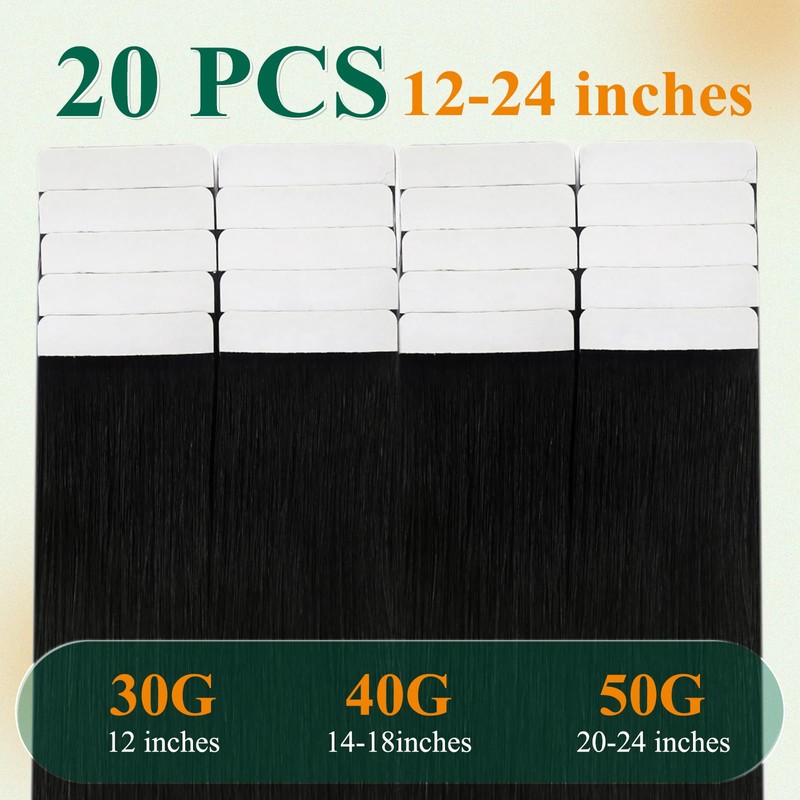 Easyouth Black Tape-In Extensions Real Hair Invisible Real Hair Tape-In Extensions Black Remy Hair Extensions Real Hair Extensions Tape Natural Shine 50 g 20 Pieces #1 50 cm