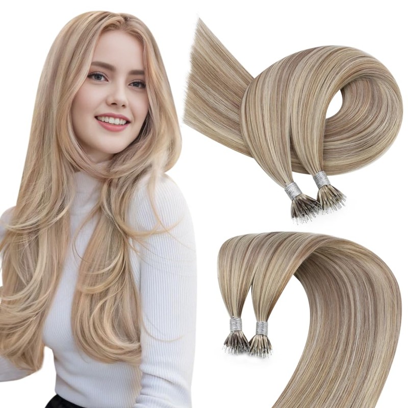 Easyouth Seamless Nanos Hair Extension Highlighted Nano Tip Hair Extensions Medium Blonde with Light Brown Nano Ring Hair Extension Daily Wear 14inch 50s/50g