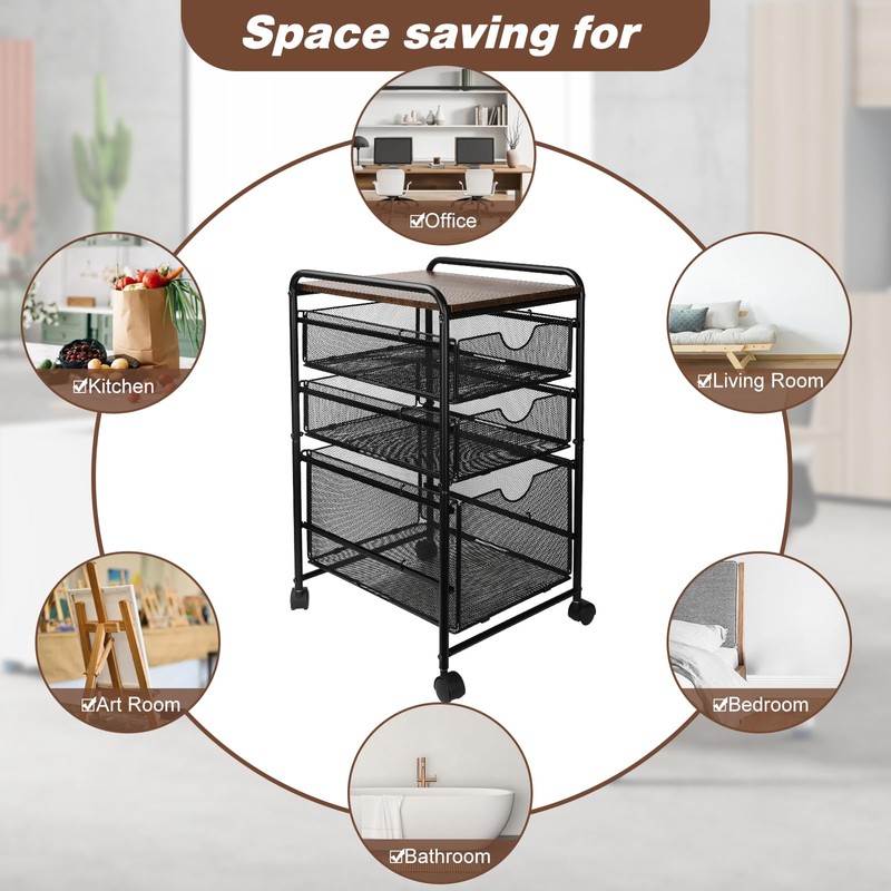 • Enhanced Visibility & Security: Visualized mesh drawers allow instant content checks, while anti-pull-out design on small baskets prevents accidental spills. Front wheels with brakes keep the cart securely in place.