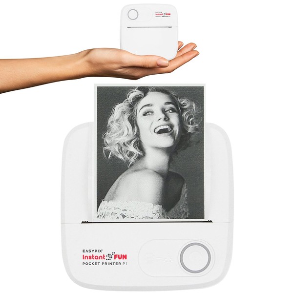Easypix InstantFUN Pocket Printer P1 Mobile Mini Printer, Black and White Thermal Printing, Prints without Ink, with Smartphone App, Includes Sticker and Refill Paper