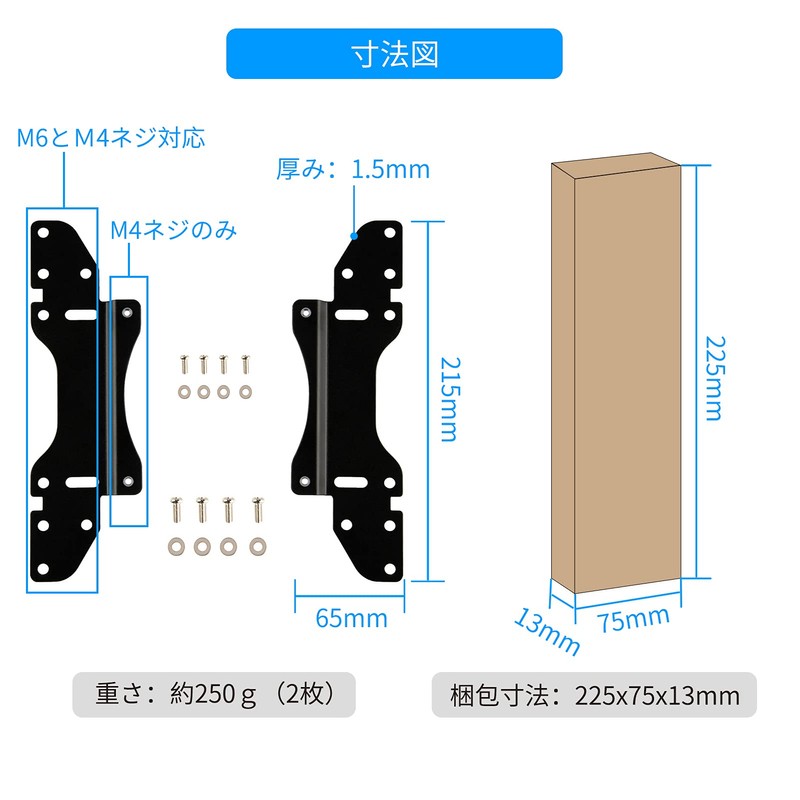 - Package Dimensions: 8.9 x 3.0 x 0.5 inches (225 x 75 x 13 mm), Monitor Arm VESA Conversion Plate x 2, M6T Screws x 4, M6T Screws x 4, M4 Rings x 4, Japanese Installation Instruction Manual x 1