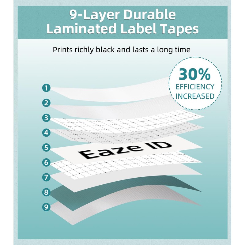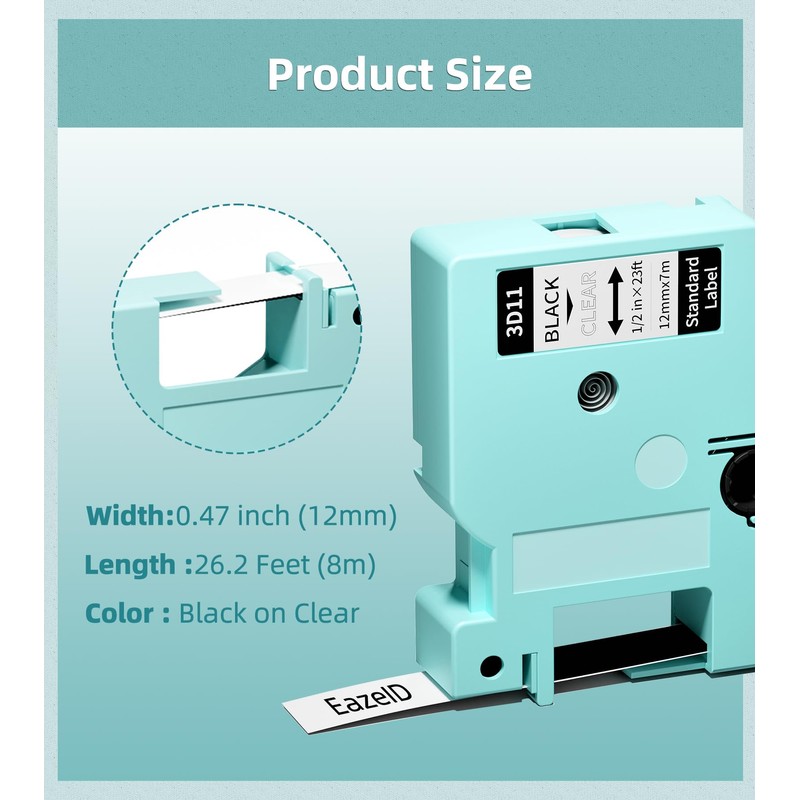 - Easy to peel : The EazeID Tape 12mm (0.47 Inch) laminated tape boasts a strong adhesive that securely sticks to surfaces, yet leaves no sticky residue when labels are removed. You can trust that your labels will stay in place without smudging or smearing. The split back of the label tape is designed for easy peeling and can be applied to multiple surfaces with ease. Furthermore, the printed labels are clear and durable, ensuring long-lasting legibility and organization