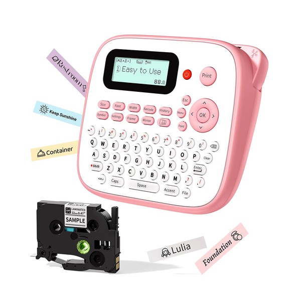 EazeID Pink Label Maker Machine with-Tape, Kids Label Maker Waterproof-Labels, D210S Portable Labeler Machine Multiple Fonts Frames Barcode for Home Kitchen Office School Use