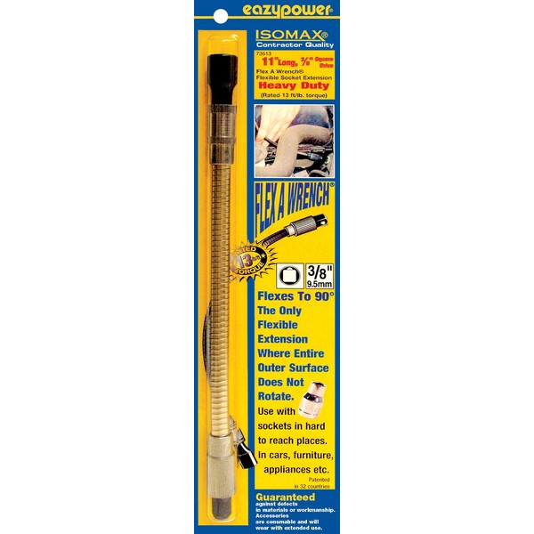 EAZYPOWER patented flex-a wrench is designed to help get into hard to reach spaces. For use in any 3/8" Square receiver, It acts an extension and flexes to 90 degrees. The outside surface does not rotate, making it safe for power tool use. Great for auto mechanics cabinet makers and appliance repairmen.