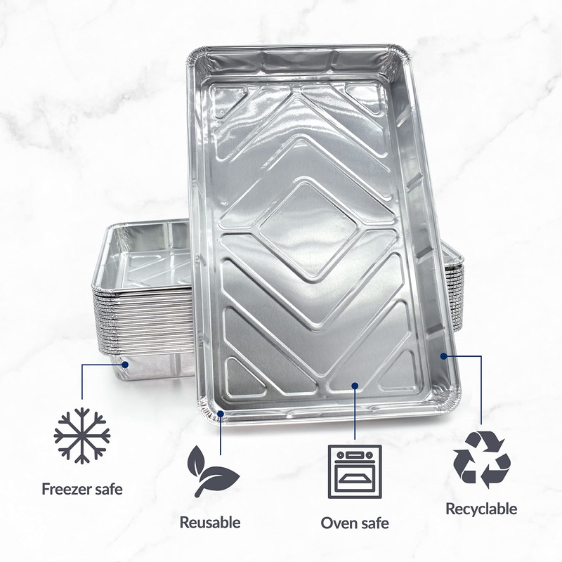 - 🎂【 Reusable and Recyclable 】 Unlike disposable plastic containers, our foil trays large are a better option as they don't contain chemicals that may be harmful to your health. Aluminium foils protect your food better and keep it at a higher temperature for longer. It's easy to store leftovers in the fridge, and you can just pop them right into the oven to reheat. Once you're done with them, they can be recycled and used to make a wide variety of finished items, including automobiles!