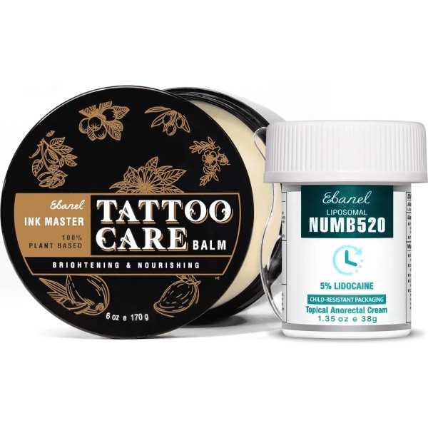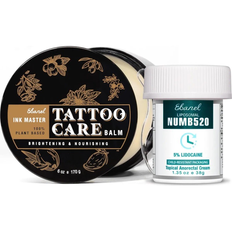 Crema Numb520: esta crema tópica de lidocaína adormece al 5% está clínicamente probada para aliviar temporalmente el dolor, ardor, picazón y molestias, y reducir la inflamación y el dolor. Esta crema antipicazón para aliviar el dolor proporciona alivio inmediato para dolores menores, cortes menores, rasguños menores, quemaduras leves, quemaduras solares, rasguños e irritaciones menores de la piel. También funciona para aliviar la picazón de picadura de mosquito, alivio de picazón de picadura de insecto, alivio de picaduras de insectos, alivio posparto, tratamiento de encogimiento de hemorroides y trastornos anorrectales; Crema Numb520 - Liposomal mejorada para una penetración profunda, esta crema anestésica de la piel sin aceite comienza a adormecerse en 3-5 minutos, alcanza su punto máximo después de 20-25 minutos y dura 1 hora desde su pico. El rendimiento del adormecedor puede variar dependiendo del grosor del área de la piel y del metabolismo individual. Aplicar antes, durante y después del tratamiento, puede volver a aplicar hasta la mitad para un efecto mejorado. Fórmula a base de agua para una fácil aplicación y eliminación sin ensuciar; Ink Master Tattoo Balm - Repleto de esencias herbales ricas en antioxidantes y vitaminas, botánicos y aceites esenciales, este bálsamo para tatuajes 100% natural forma una barrera protectora y transpirable sobre la piel, bloquea la humedad y promueve la curación. Esta crema para tatuajes protege los nuevos tatuajes de infecciones y evita grietas, descamaciones, decoloración y decoloración de la tinta. Esta mantequilla para tatuajes ilumina y mejora la vitalidad de la tinta, preserva la profundidad, la claridad y el contraste para el arte corporal; Ink Master Tattoo Balm - Infundido con ingredientes botánicos a base de hierbas, este ungüento para tatuajes ayuda a aliviar la picazón, el dolor, el rojecimiento y la hinchazón, y minimiza las cicatrices. También funciona como un bálsamo curativo multiusos para reparar la barrera de la piel y ayudar a reparar la piel y cutículas secas, agrietadas y resecas, labios agrietados, cortes menores, quemaduras, moretones, rasguños y erupciones cutáneas, aliviando la psoriasis y el eccema. Cuidado posterior prémium para piercings, depilación, microblading, maquillaje pospermanente y eliminación de tatuajes; Fabricado en Estados Unidos en una instalación registrada por la FDA, probado por dermatólogos, libre de crueldad, certificado cGMP. Hipoalergénico, no irritante. Sin fragancia, sin parabenos, sin productos químicos agresivos, no adictivos. No graso, fácil de esparcir, absorción rápida, duradera, sin residuos, no obstruye los poros ni elimina las plantillas. Para todos los tipos de piel y colores de tinta.