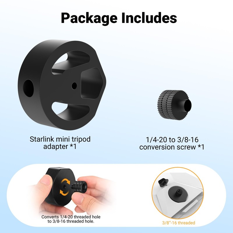- Wide Compatibility: Equipped with a 1/4-20 threaded hole + 3/8-16 conversion screw (included), this adapter seamlessly connects to tripods, clamps, or RV rail mounts for Starlink Mini, transforming it into a versatile solution for rooftops, vehicles, tents, and more.
