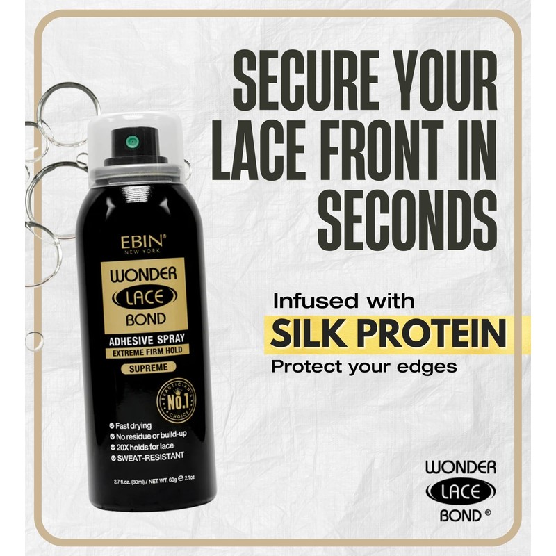 - [ADHESIVE SPRAY] Elevate your wig game with the EBIN NEW YORK Wonder Lace Bond Adhesive Spray, the ultimate melting spray designed to secure your wig flawlessly. This advanced formula seamlessly blends into your hairline, providing a natural look that enhances your wig's appearance. Perfect for lace front wigs, toupees, and hairpieces, this adhesive spray ensures a secure and flawless finish every time.