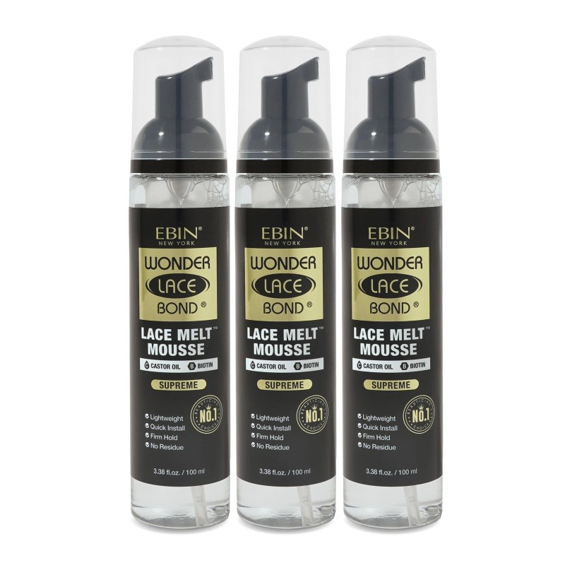 • WIG STYLING FOAM SET – Includes 3x Wonder Lace Bond Melt Mousse Supreme Hold 3.38 oz by EBIN NEW YORK for seamless lace wig application, secure hold, and edge care during styling. (Packaging May Vary)