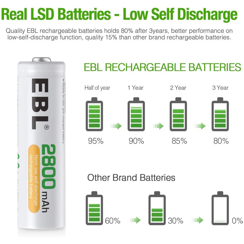 EBL AA 2800mAh High Performance Ni-MH Rechargeable Batteries, 4 Pack
