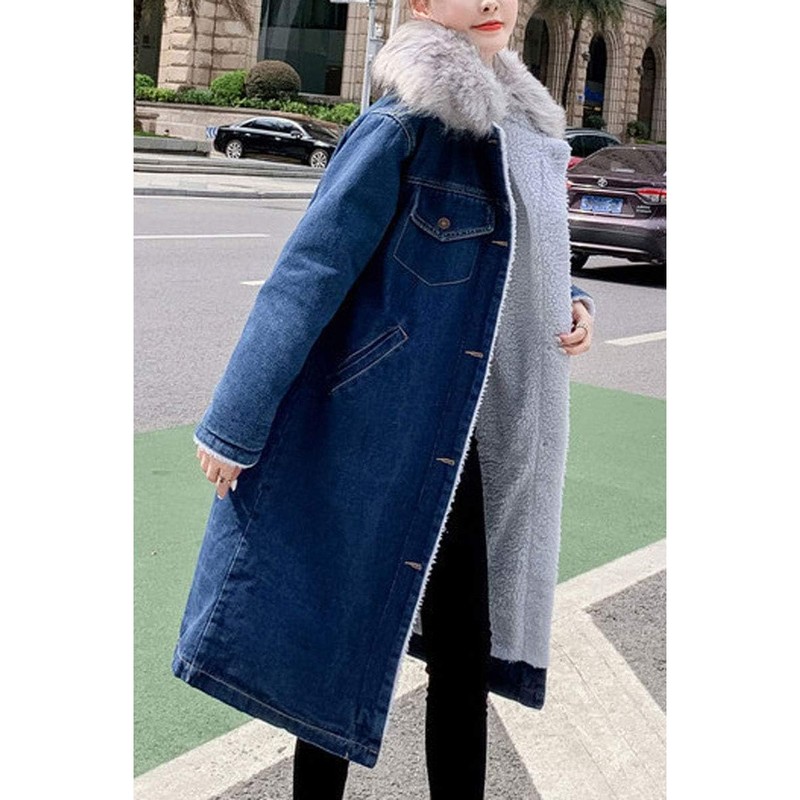 - Fully lined, maxi length, casual warm sherpa denim jacket jean coat