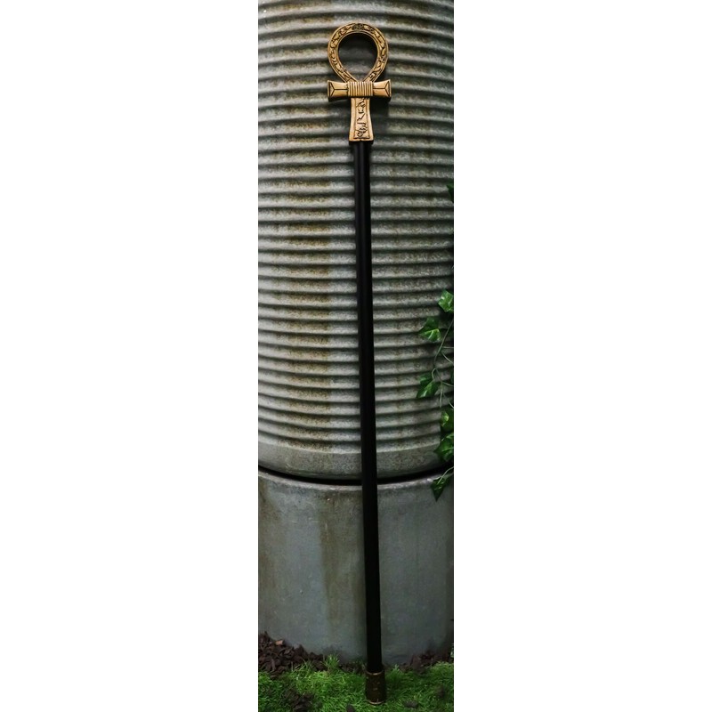 • Your steampunk costume outfit can now be complete with this Egyptian Themed Ankh Key of Life swagger stick. Featuring a handle shaped like the mythical Ankh or the Key Of Life, the face of the ankh is painted in black and gold while brandishing many egyptian hieroglyphs all throughout. The ankh shaped amulet symbolizes Balance, Health And Life in its fullness.