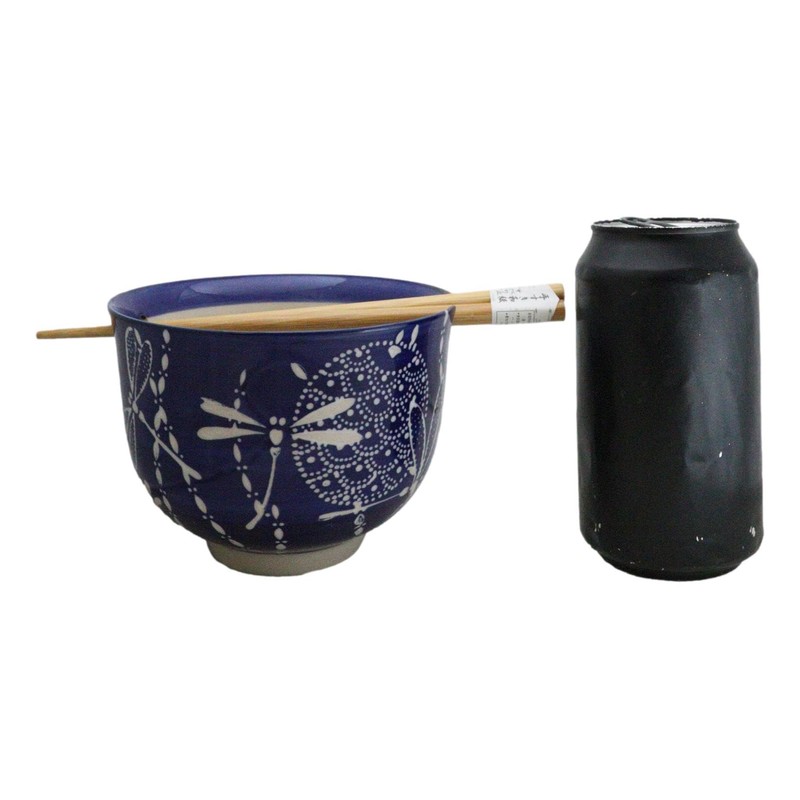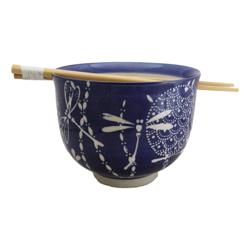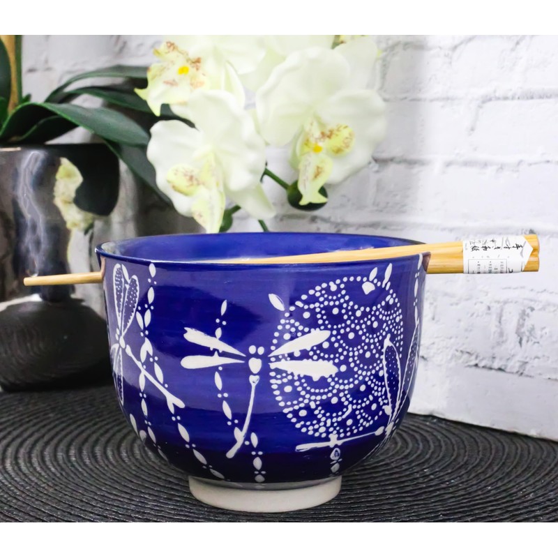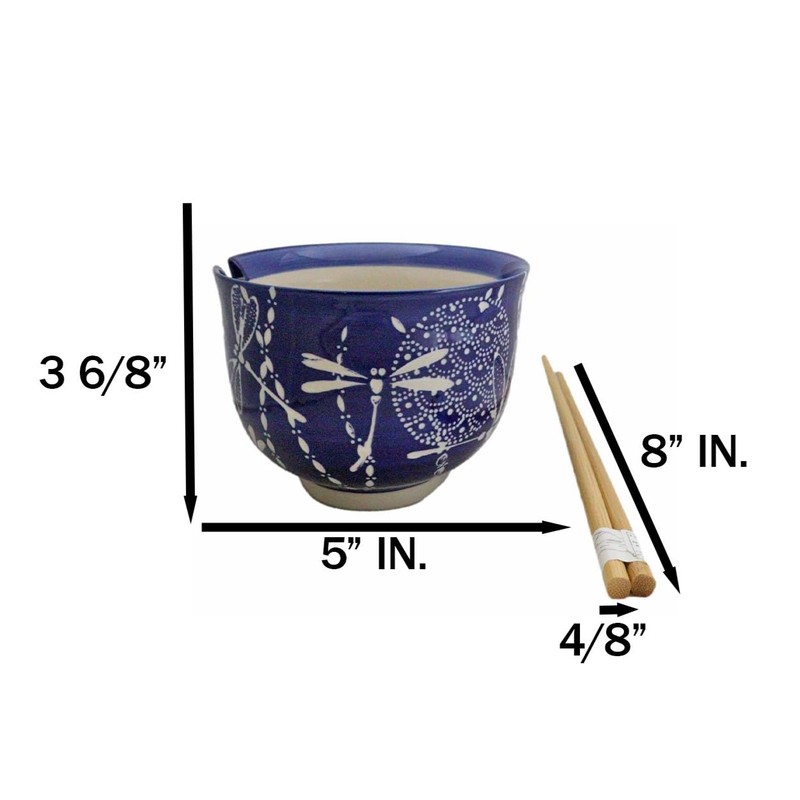 Ebros Gift Artistic Donburi Ramen Udon Noodles Soup Salad 5" D 18Oz Bowl With Bamboo Chopsticks And Built In Rest Set Asian Dining Kitchen Accent (Blue Tombo Dragonfly)