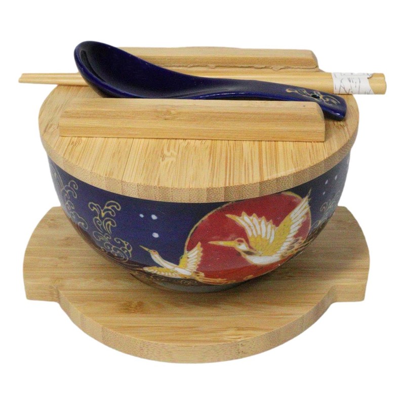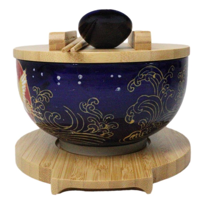 Ebros Gift Artistic Donburi Ramen Udon Noodles Soup Salad 6" D 28Oz Bowl With Bamboo Lid Trivet Base 'Renge' Spoon And Chopsticks Set Dining Kitchen Accent (Purple Midnight Red Moon Crane)