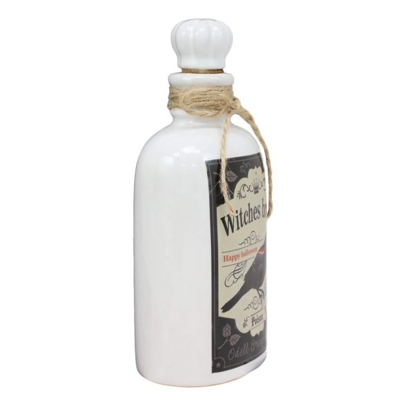 • This unusual bottle looks as though it has just been taken from an apothecary. Predominantly white, this bottle features an aged 'label' that reads "Witches Brew, Happy Halloween”, with a harbinger of doom raven crow in the center. This poison bottle is the perfect prop for your Halloween party or dark alchemy, witchcraft, mad scientist/doctor themed events. The bottle is decorated with jute strings near the opening and a cork lid seals the bottle at the top.