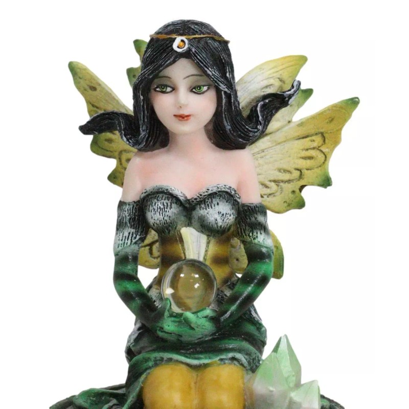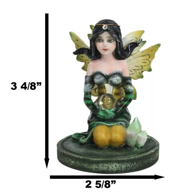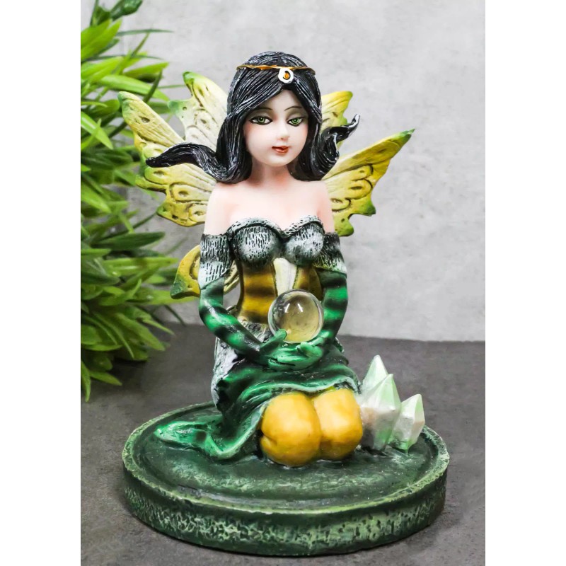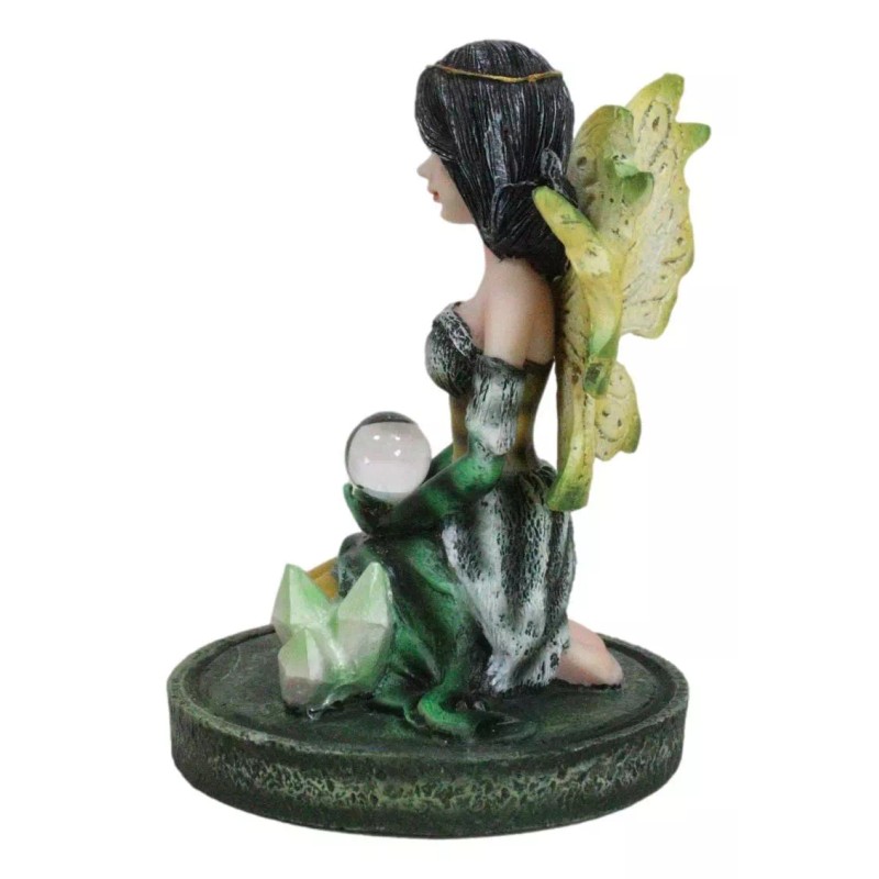 • Step into a world of enchantment with our Kneeling Bumblebee Fairy Figurine, a delightful masterpiece that captures the whimsy of the fairy realm. This small figurine features a charming fairy in a kneeling pose, adorned with the vibrant colors of a bumblebee, delicately holding a crystal ball. Nestled on a crystalline garden, the intricate details bring this magical creature to life.