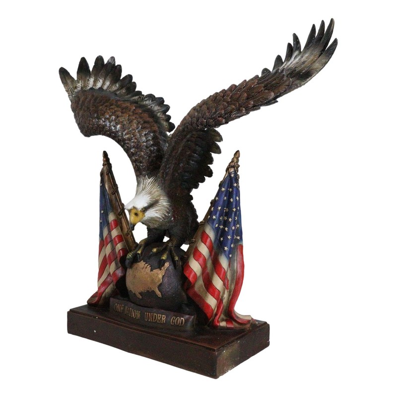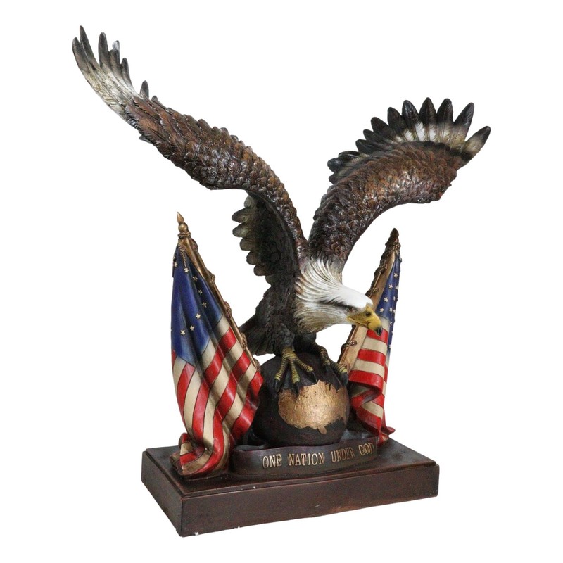 - Upheld for generations as the image of freedom, the Large American Bald Eagle comes to life in this impressive, finely detailed statue. Our swooping eagle stands on a glove with the map of USA with the words One Nation Under God is imprinted underneath it. 2 American Flags are displayed underneath each wing. Add style and patriotism to the table, bookshelf or desk with this unique sculpture. They make wonderful gifts and decorations for politicians, lawyers, historians and patriots.