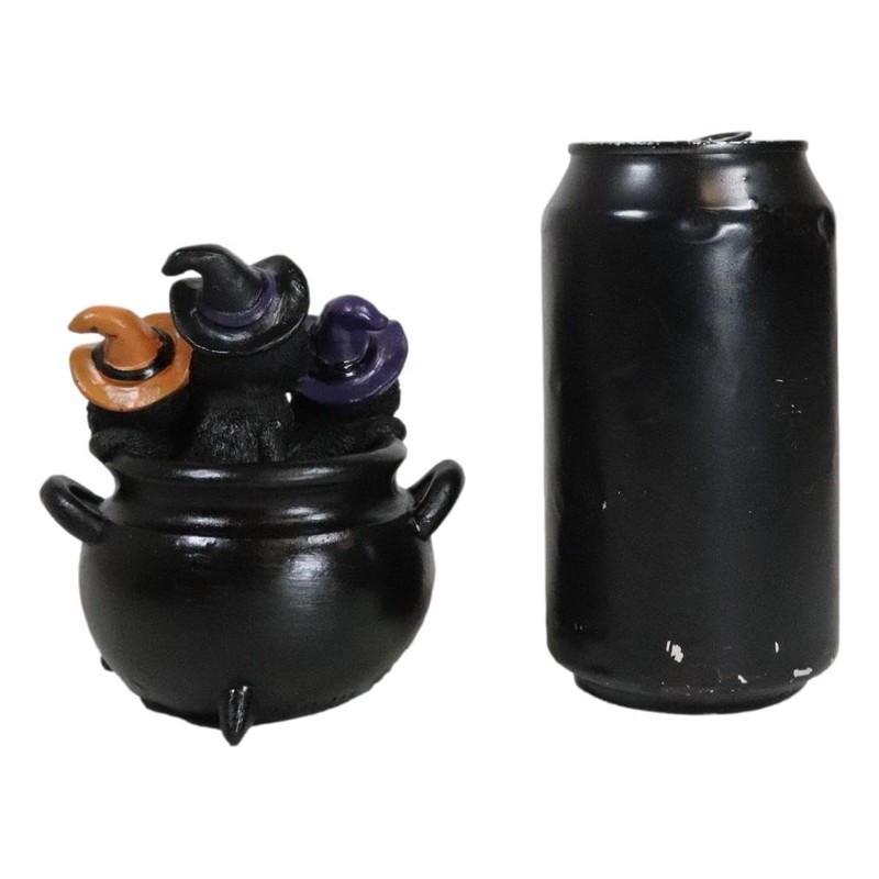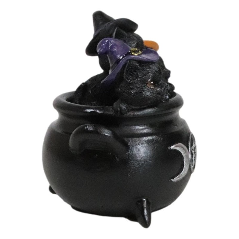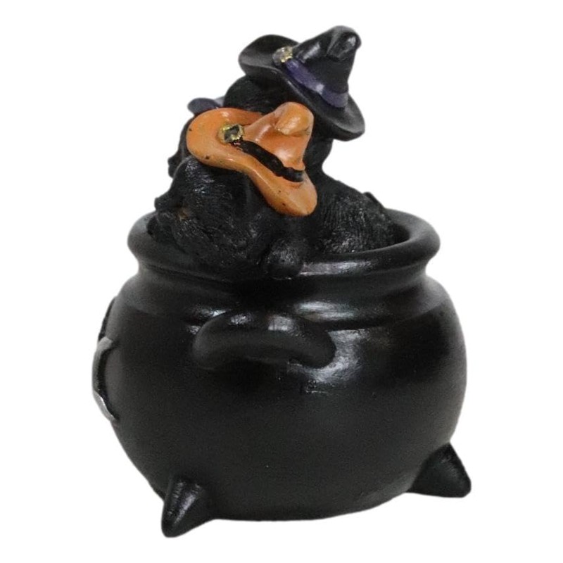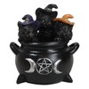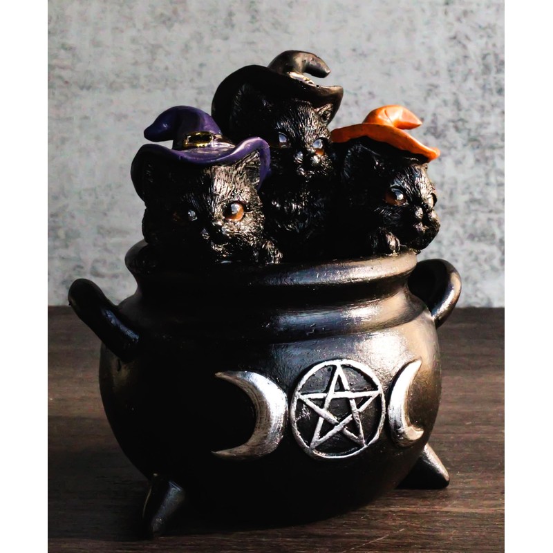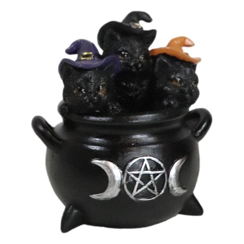 Ebros Gift Mystical Wiccan Hocus Pocus Trio Feline Black Cat Kittens with Witch Hats Sitting in Triple Moon Fire Cauldron Figurine Halloween Macabre Accent