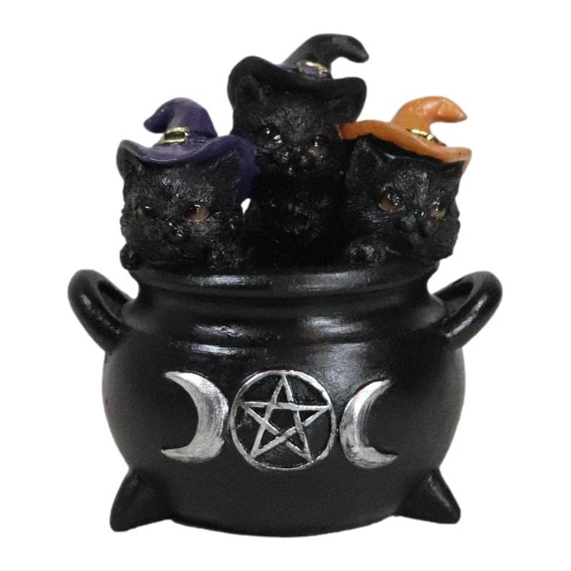 - Introducing our whimsical Trio of Wiccan Kittens With Witch Hats, nestled within a Triple Moon Cauldron—a delightful and enchanting addition to your mystical decor. Crafted with playful attention to detail, these adorable feline witches are the perfect embodiment of the witching season. With their charming hats and mischievous expressions, they bring a touch of spellbinding charm to any space.