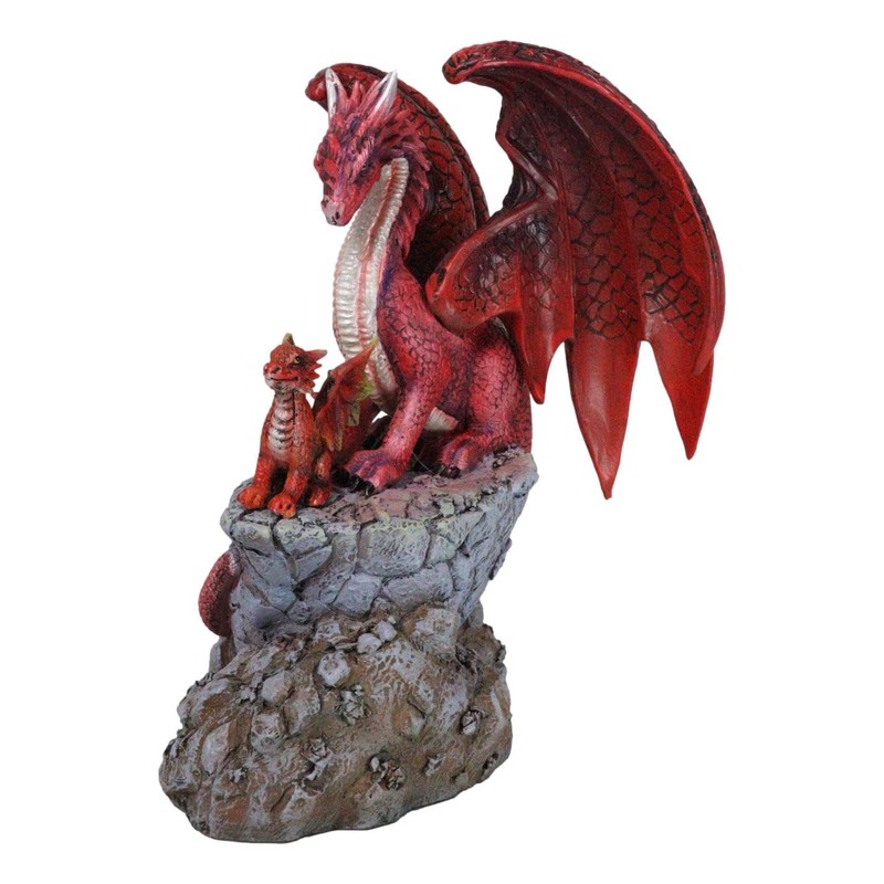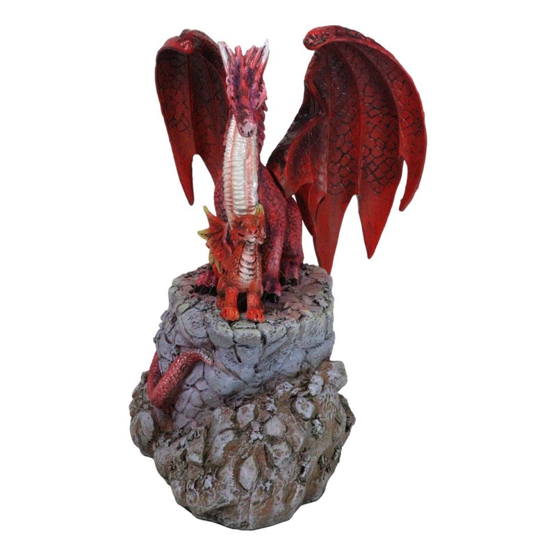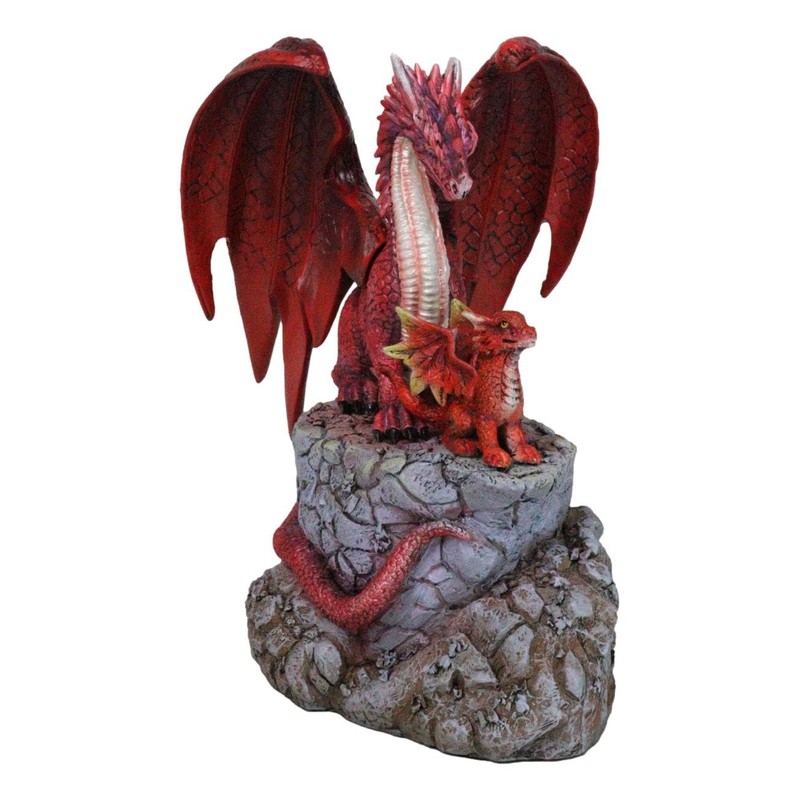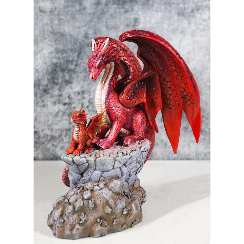 - Unleash the fiery power of the Red Lava Dragon with Hatchling Standing on Rock Cliff Figurine. This striking piece features a powerful red dragon, its scales glowing with molten lava hues, standing proudly atop a rugged rock cliff. With fierce protection, it watches over its tiny, vulnerable hatchling, symbolizing the bond between parent and child. The intricate craftsmanship and dynamic details, from the swirling lava to the rocky base, capture the raw energy of the dragon's fiery nature.