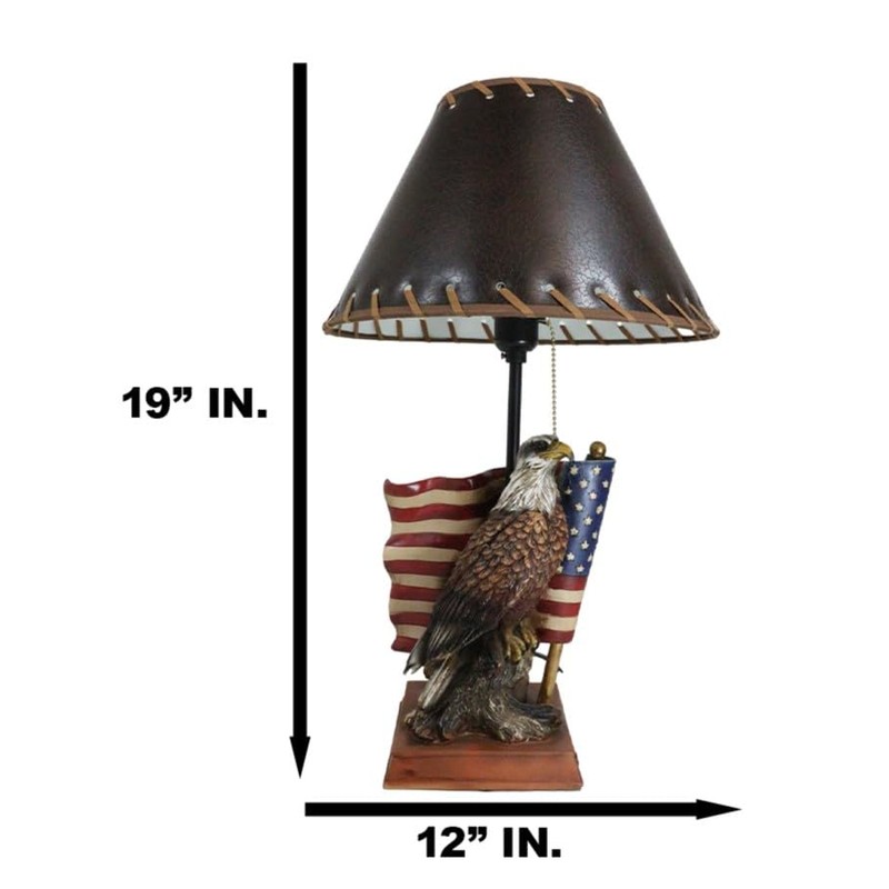 • This Patriotic Bald Eagle With American Flag Memorial Table Lamp measures 19" High overall with the shade installed. The sculptural lamp base part measures 7" Wide by 6.25" Deep approximately. The lamp shade is 12" in diameter.