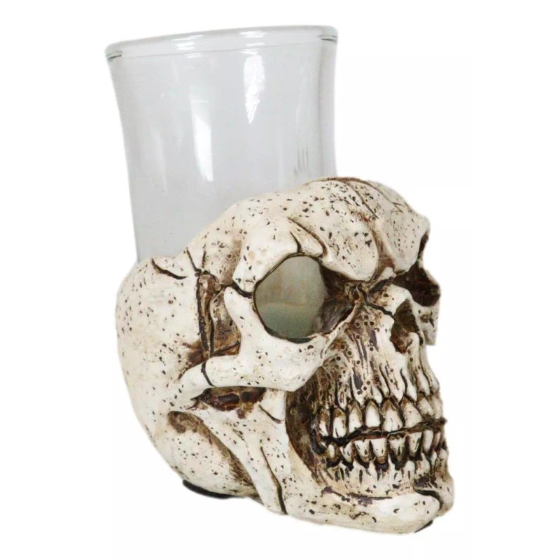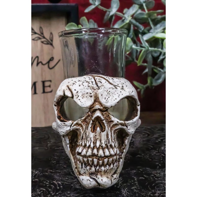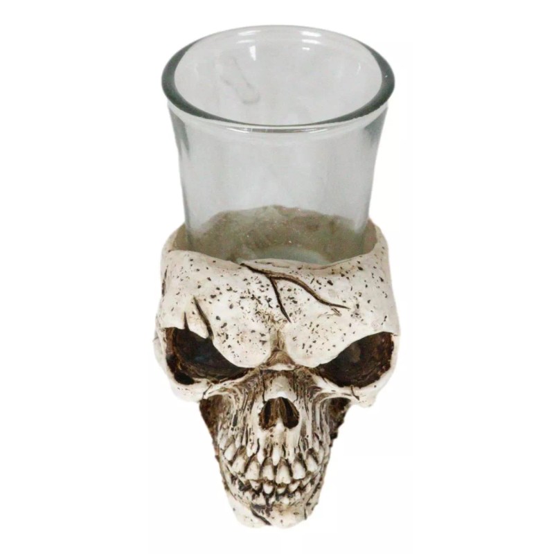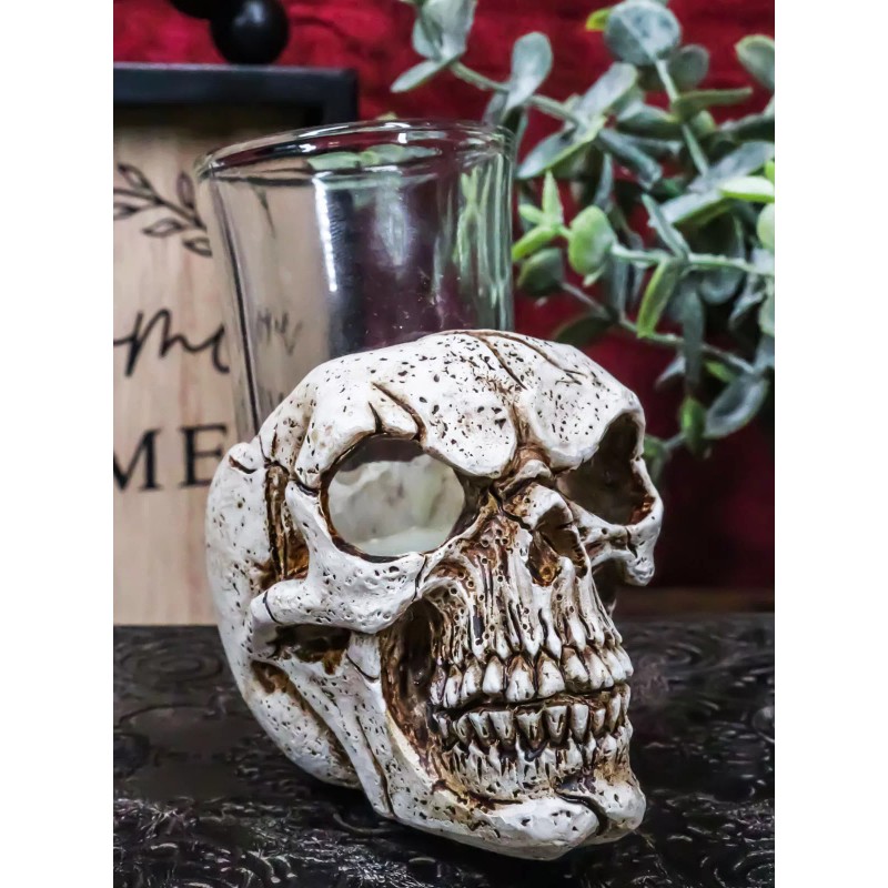 • This Spooky Gothic Skull Shot Glass Holder is made of polyresin, hand painted and polished. Each skull comes with an accompanying shot glass.