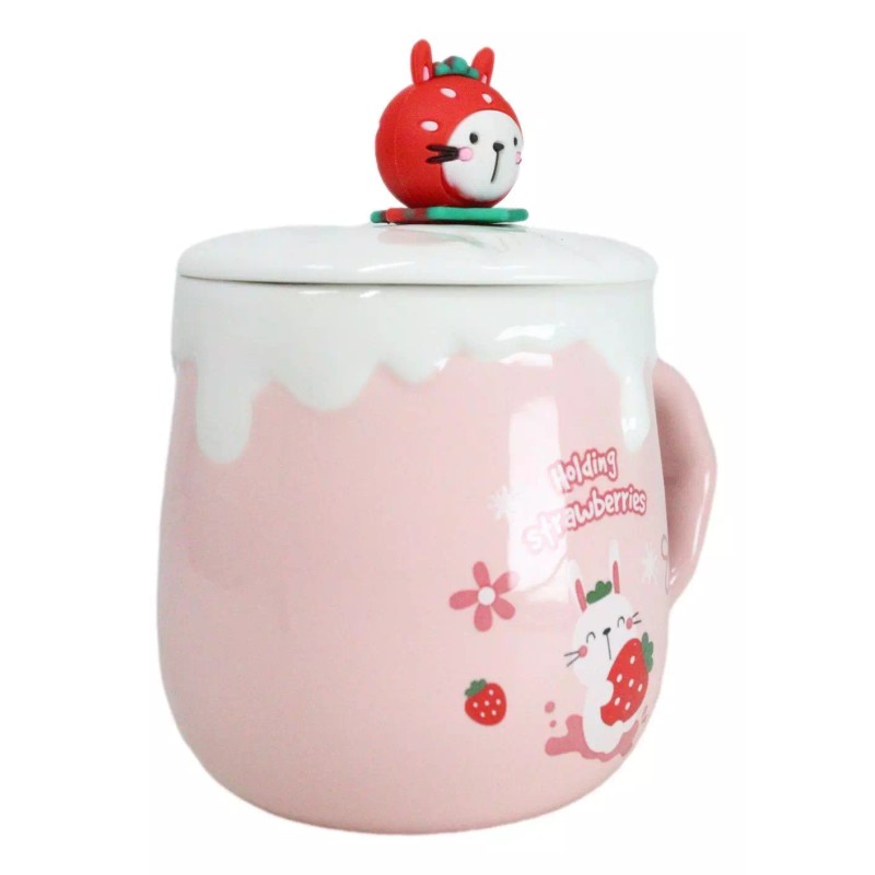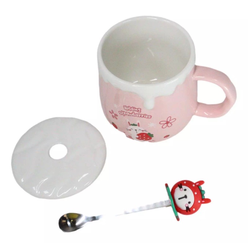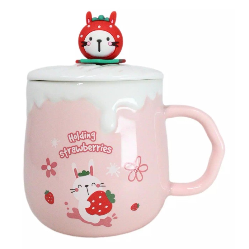 • Embrace the charm of nature and whimsy with this Cute Whimsical Bunny Rabbit With Strawberries Ceramic Mug! Featuring an adorable bunny nestled among fresh strawberries, this mug is a delightful blend of sweetness and fun. The white whipped cream looking lid and the strawberry hooded bunny stirring spoon add playful and unique touches, making it the perfect companion for your morning coffee or tea.