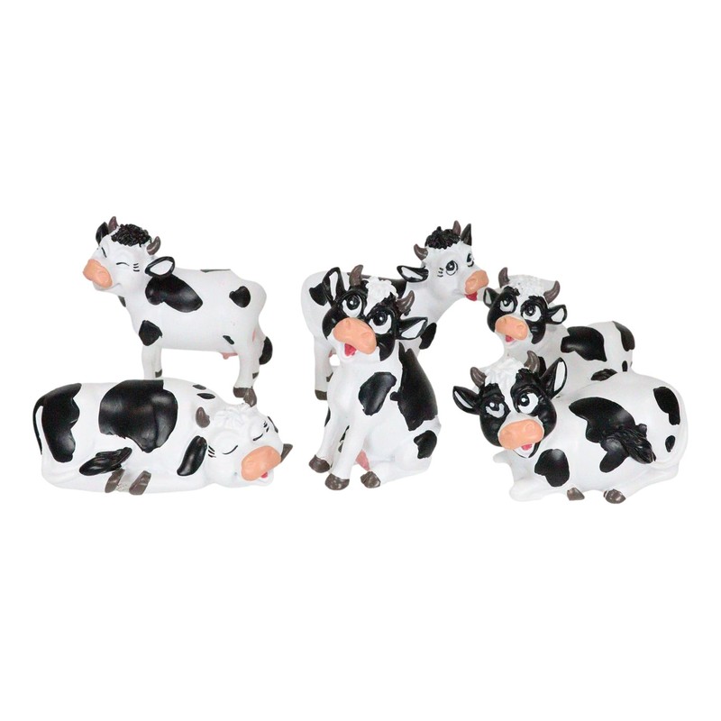 - A set of 6 assorted cows that will brighten up any shelf or tabletop. Includes all poses pictured, each with a unique personality. Makes a great gift for bovine fans.