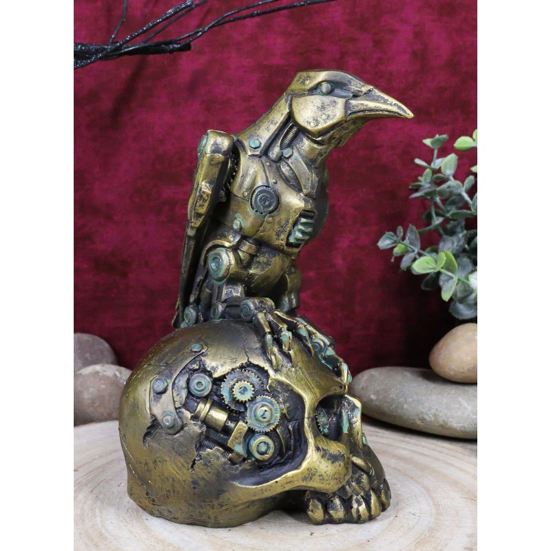 • This Steampunk Raven Bird Perching Atop Cyborg Skull Sculpture is made of designer composite resin, hand painted and polished individually.