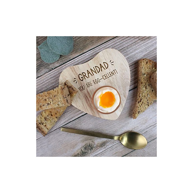 • This heart shaped breakfast board with egg holder is perfect, we precisely engrave "Grandad You Are Egg-Cellent" in the top centre of the board that will look just as stylish on display in the kitchen as it will when filled with dippy eggs and soldiers on the table. Any breakfast loving Grandad will appreciate this personalised egg cup on his birthday.