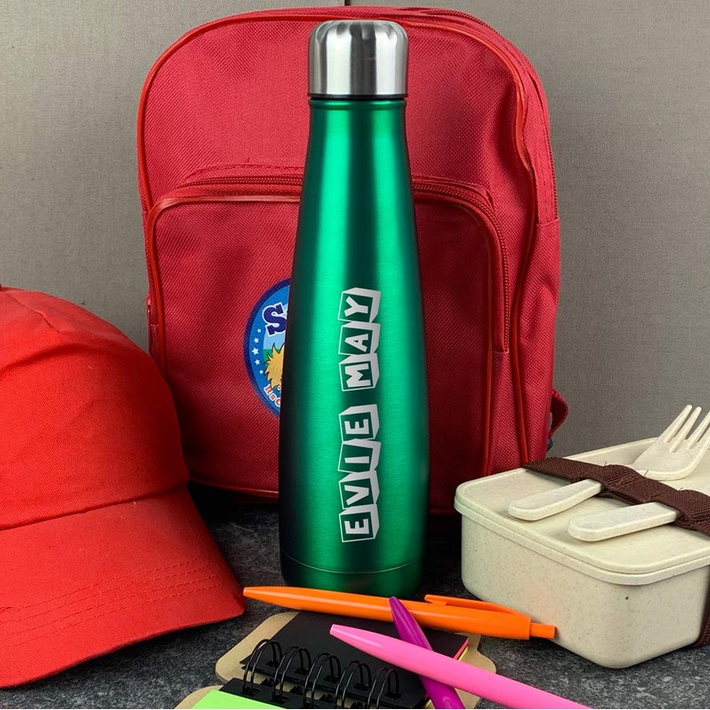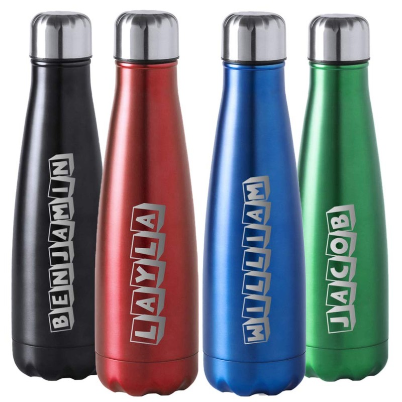 - ✅ PERSONALISE: Struggling to find of a unique, reusable water bottle for your child’s lunch box? Then look no further than our personalised coloured metal water bottles! Personalise with any name or text of your choice up to 15 characters long on two lines. We laser engrave the bottles so our building block font will be in silver, a fantastic contrast against the range of colours we have available. PLEASE NOTE. This is a permanent laser engrave & not personalised with vinyl stickers