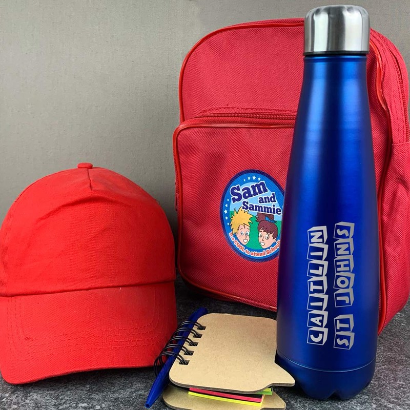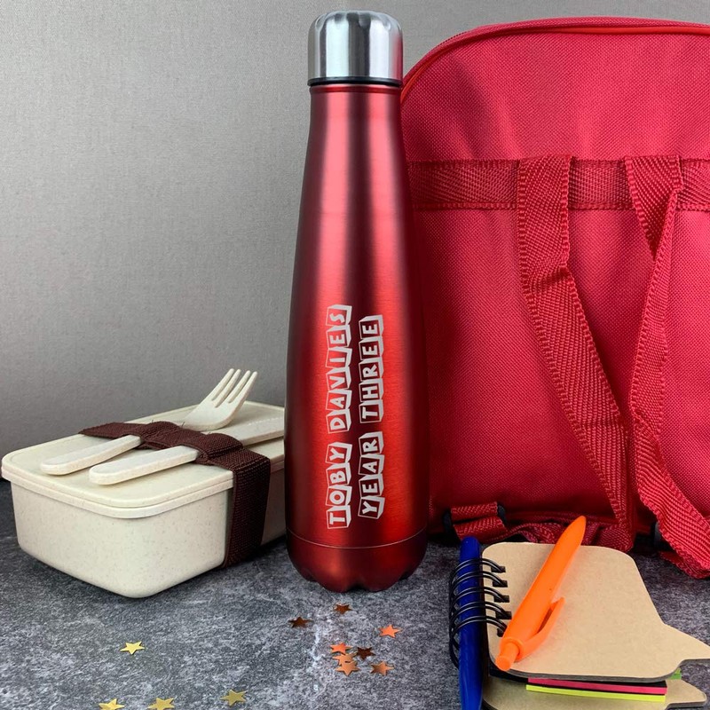 eBuyGB Personalised Children's 630ml Stainless Steel Water Bottle Flask - Childs Custom Name, Surname, Class, Year, Group - Use for School, Sports and Clubs (Red)
