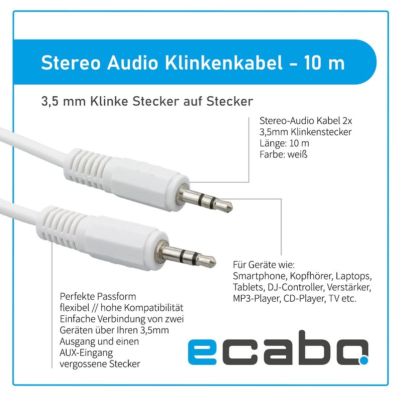 ecabo 10017 Stereo Audio Jack Cable 3.5 mm Jack Male to 3.5 mm Jack Plug - AUX Cable - for Car Radios, MP3 Players, Receivers, Computers, Laptops, 10.0 m, White