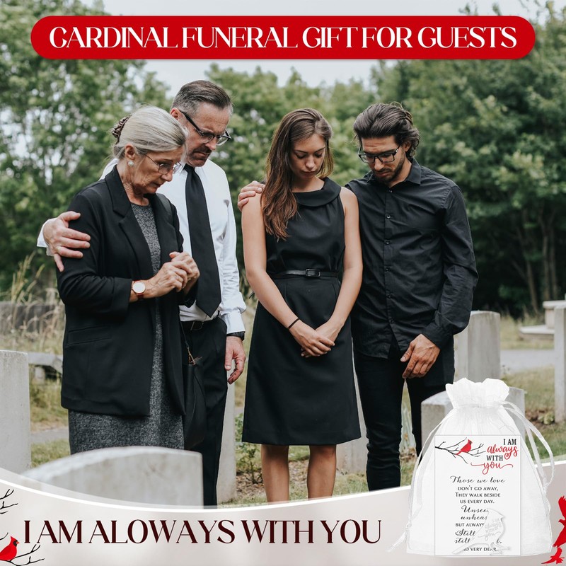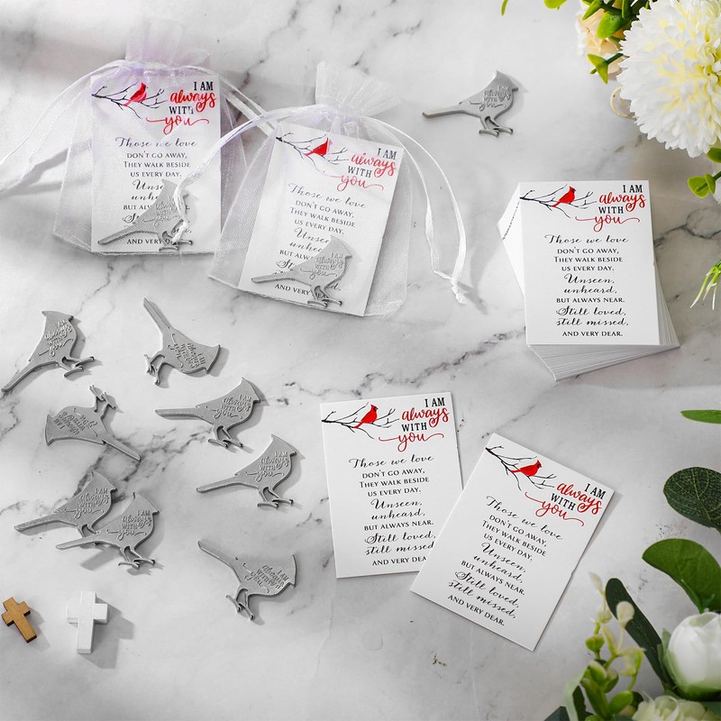 - Abundant Funeral Favors for Guests: our funeral favor set includes 50 cardinal coins, 50 memorial poem cards, and 50 white organza bags; These items are beautifully matched to provide a meaningful token of remembrance for guests at a funeral or memorial service