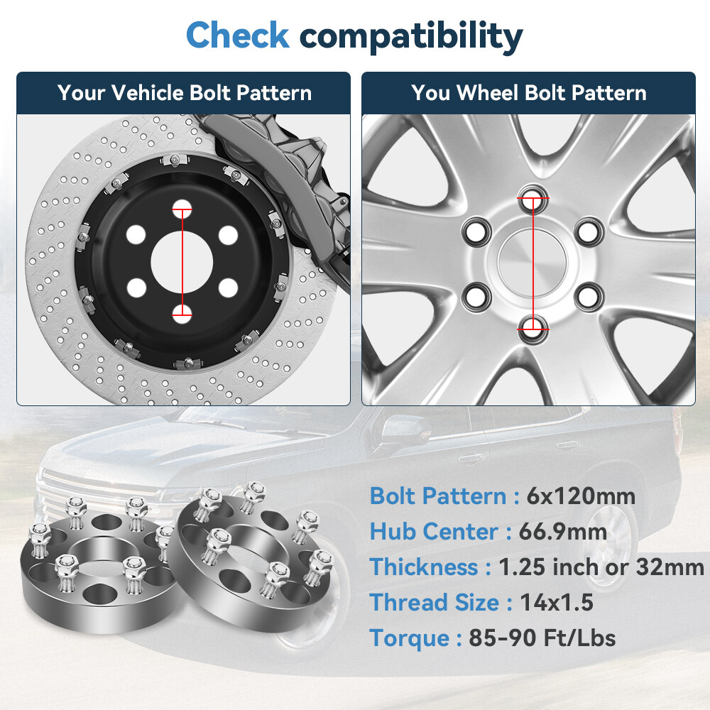 1. Check Your Vehicle Bolt Pattern/ PCD, Hub Bore Size, Thread Pitch, Vehicle fitment compatibility is only a guide.