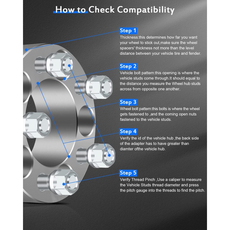 -Your vehicle may have different thread pitch wheel studs than what's supplied with these wheel spacers. This means you would need to purchase different lug nuts for proper installation. Message us for more information prior to purchasing the items.