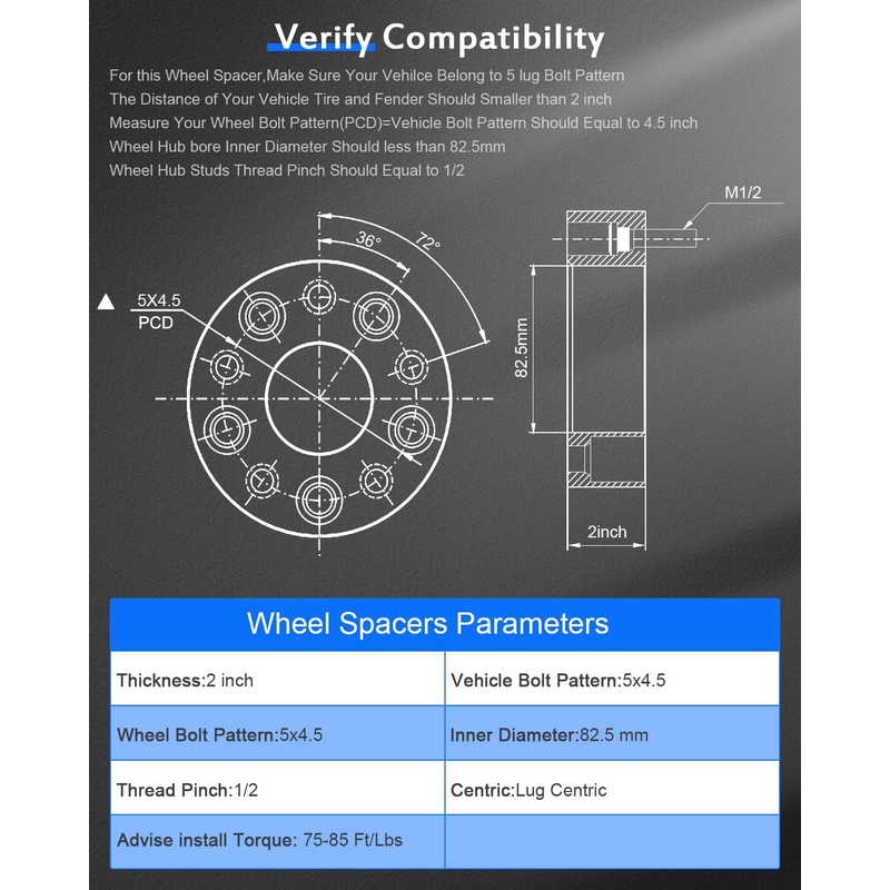 - WHEEL SPACER 5x114.3mm PARAMETER--2" Thick 5x4.5 to 5x4.5 1/2"x20 Wheel Studs Includes Open Ended Lug Nuts to install wheels to Spacers (additional lugs may be required to install onto vehicle) 82.5mm Center Bore 6061 T6 Billet Aluminum