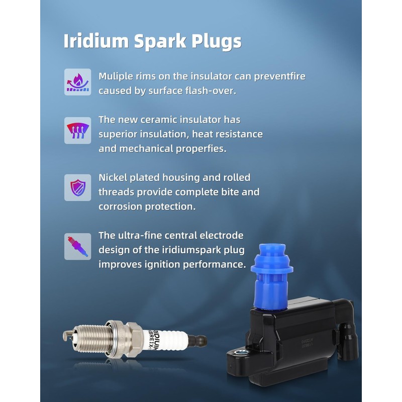 - Enhanced Coil and Spark Plug : Upgrade 15% more energy than OE coils and improve engine performance. TheIGNITION coils provide spark for your engine. Over time your factoryIGNITION coil and plugs will fail leading to poor gas mileage, misfire, hesitation, check engine light (CEL) and VSC warning lights, please replace your coils and plugs together to provide superior cold - start performance and a smoother running engine