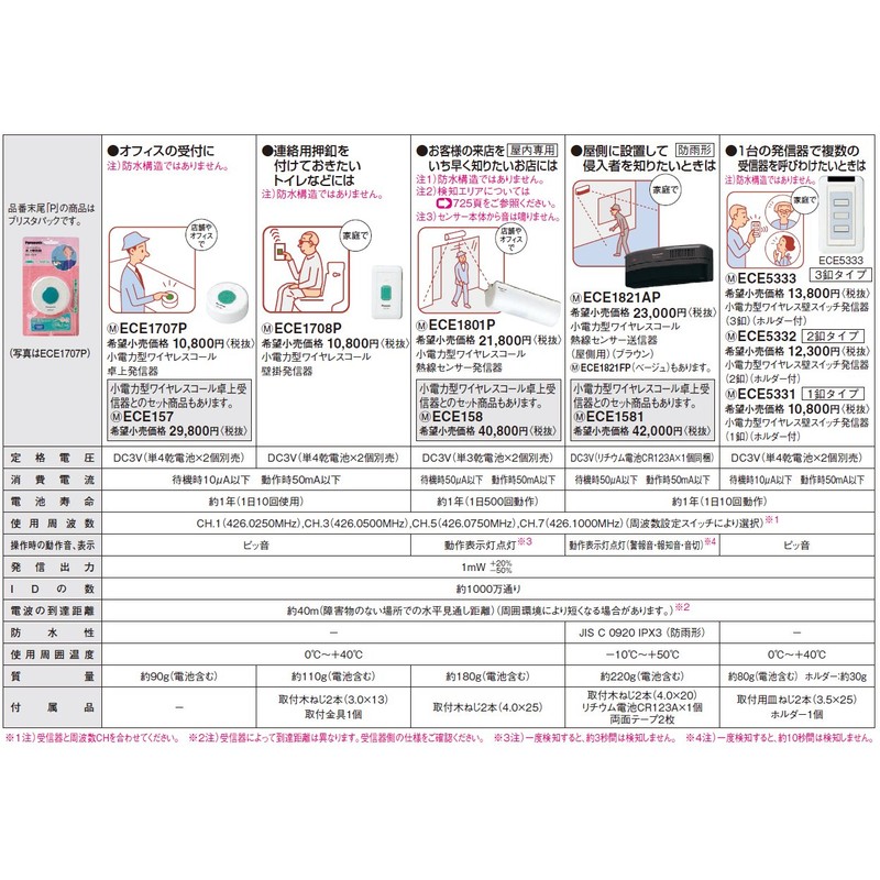 ワイヤレスコール(小電力型) ECE1707P ●規格:ワイヤレス卓上コール