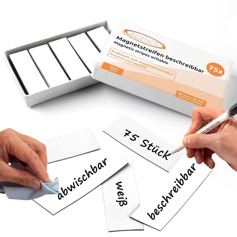 ECENCE ECENCE 75 Magnetstreifen beschreibbar - 60x20mm Weiss - zuschneidbare Haftstreifen - abwischbare Magnetschilder - Magnet-Etiketten für Whiteboards, Kühlschränke, Magnettafeln