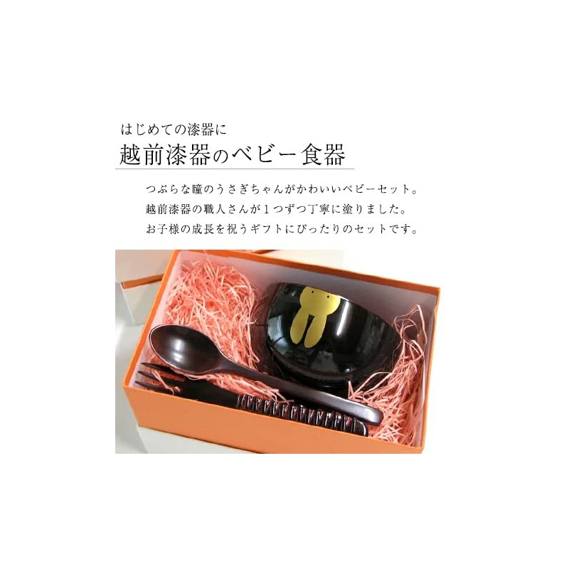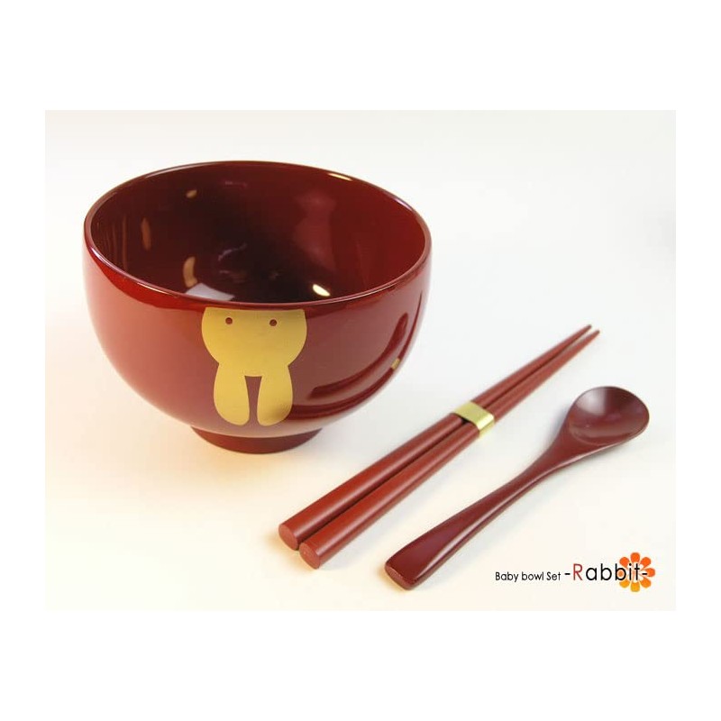 - Baby Set: Bunny with a bunny eyes! Baby Set Introducing a red color set with a cute Echizen-painted baby bowl with a bunny eyes! Each piece is carefully painted by Echizen craftsmen. Lacquered so it is safe and gentle on your child. How about a baby girl or baby shower or first annual celebration?